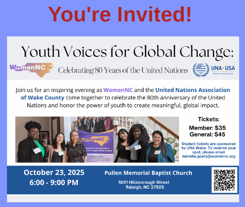 On Thursday, October 23, 2025, WomenNC and the United Nations Association of Wake County invite you to an evening where young voices take center stage.